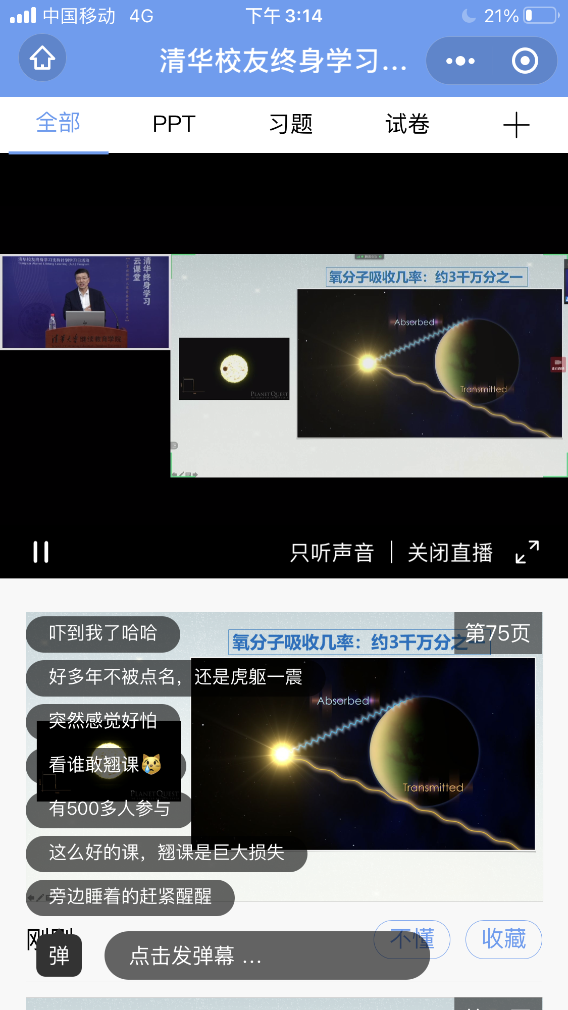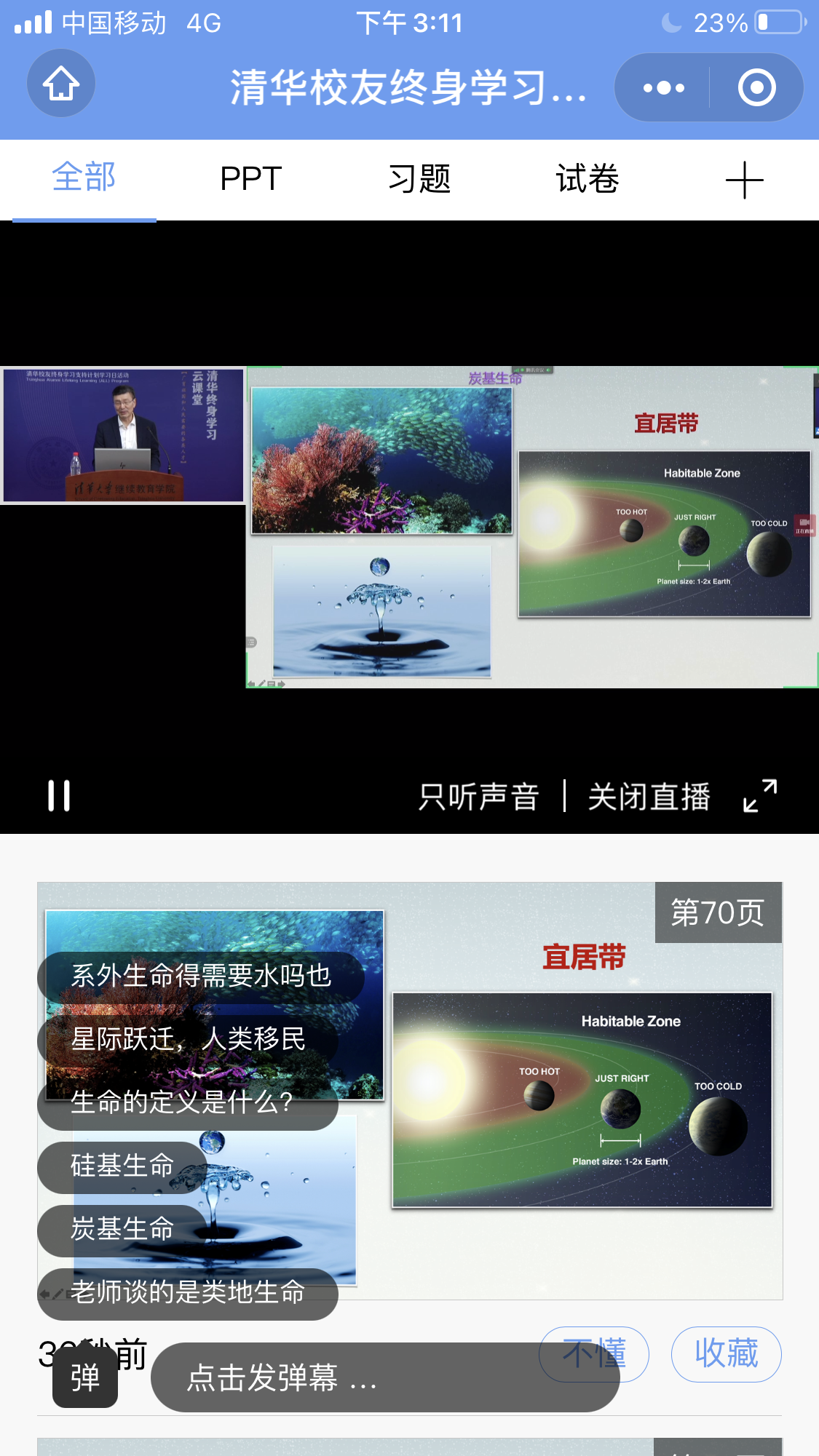 3月27日下午, “清华校友终身学习支持计划” 第23讲学习日活动,以“系外行星和地外生命”为主题,面向校友开讲。美加墨世界杯官方网站天文系主任毛淑德教授应邀作主题报告,为校友带来一场地外探索的知识盛宴。本次活动海内外600余名校友通过“荷塘雨课堂” 参与在线学习。