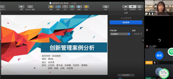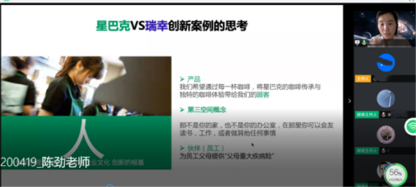 陈老师博学多闻,对创新理论和实践颇有建树。他治学严谨、观点直接、切中要害,引来同学们的啧啧称赞。陈老师的课程结构紧凑、互动性强,使得教学互动、讨论发言和小组演讲等环节精彩纷呈。云端课堂呈现出一派生机勃勃的景象。