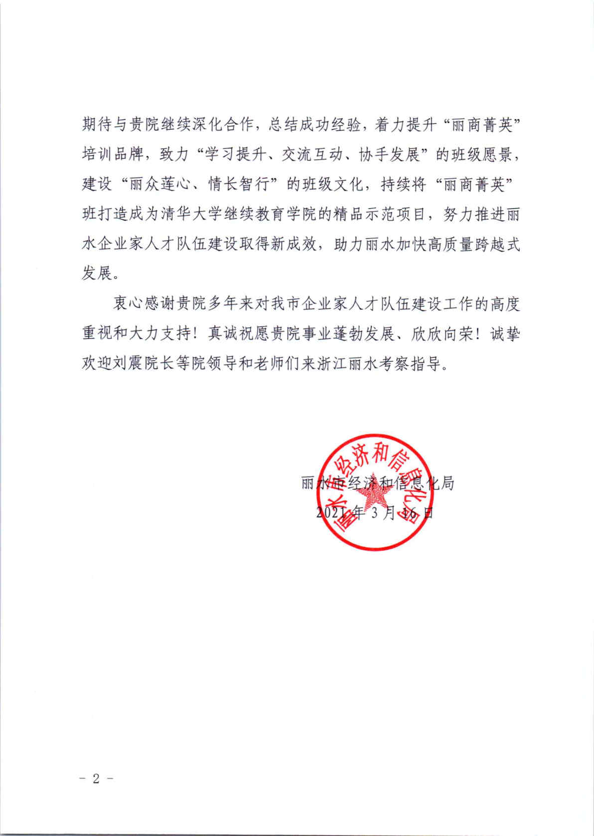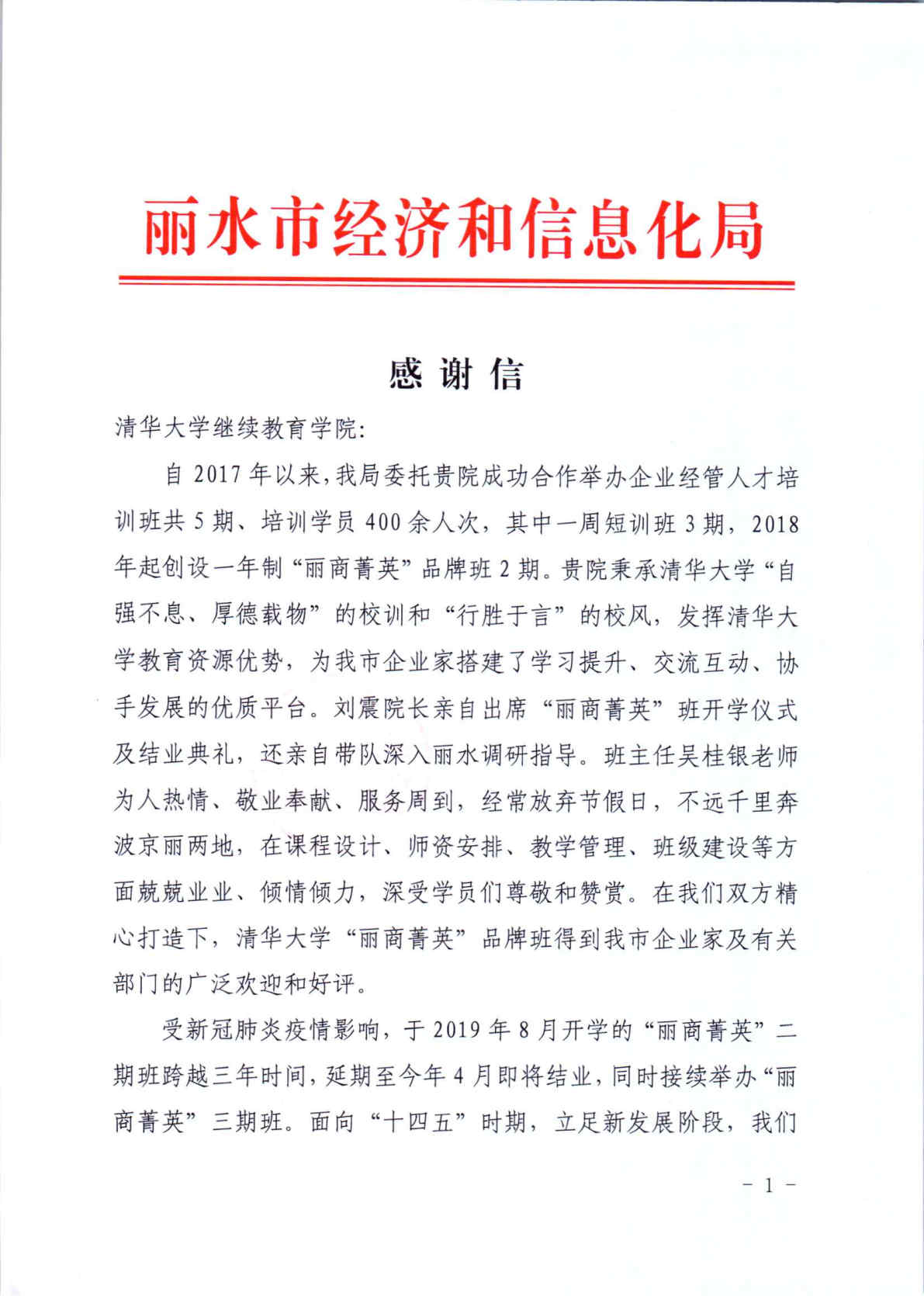 丽水市经济和信息化局致美加墨世界杯官方网站继续教育学院的感谢信