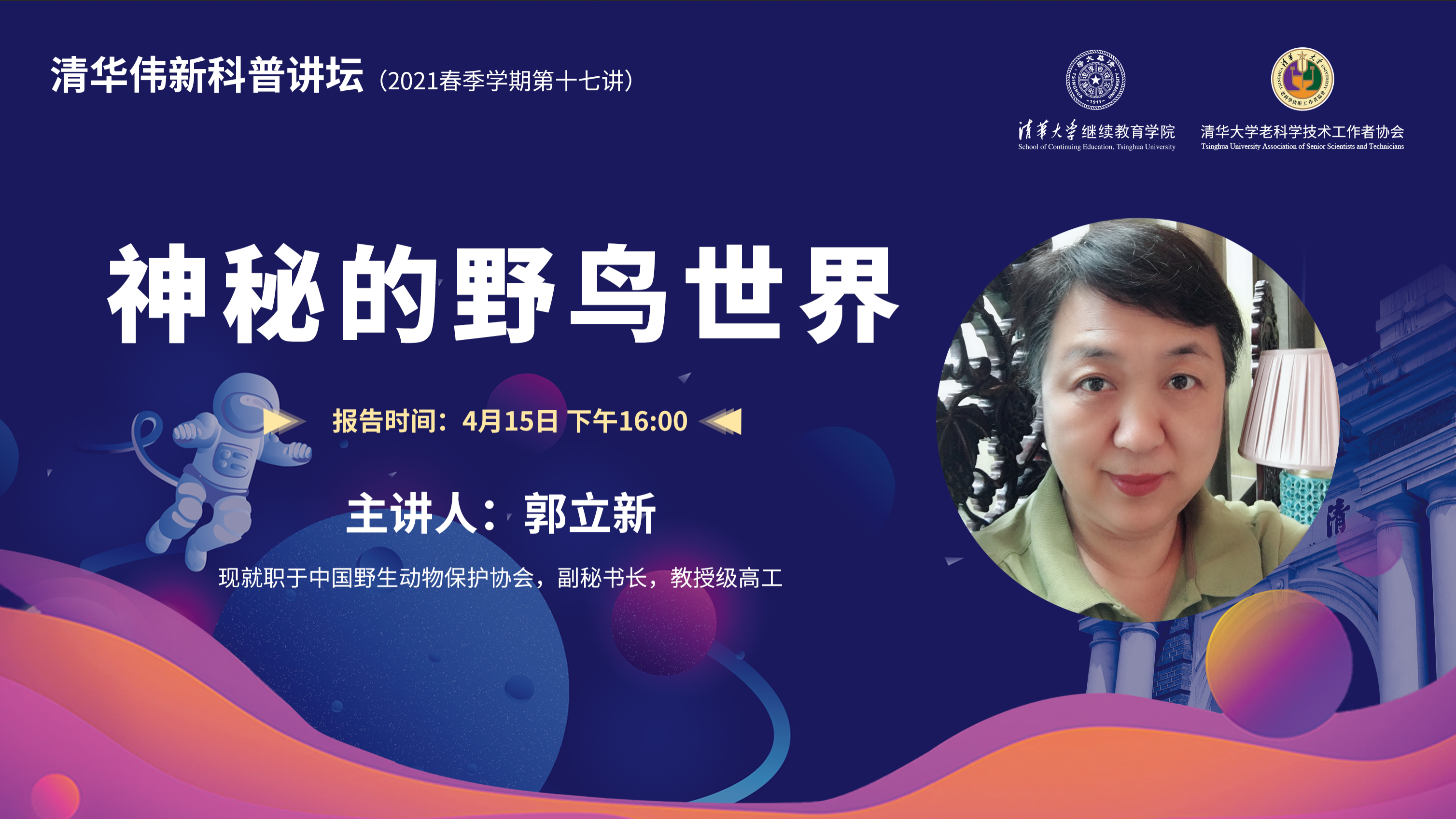 4月15日下午,清华伟新科普讲坛第十七讲通过雨课堂在线开讲。讲坛由香港伟新教育基金提供支持。本讲由中国野生动物保护协会,副秘书长,教授级高工郭立新讲授“神秘的野鸟世界”。来自17个省40个县区的美加墨世界杯官方网站乡村振兴远程教学站所在地学校师生共计26万余人参加学习。