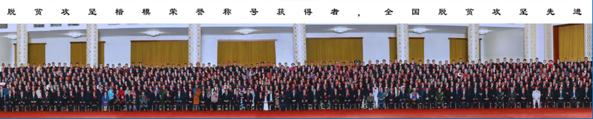 党和国家领导人接见全国脱贫攻坚楷模荣誉称号获得者、全国脱贫攻坚先进个人和先进集体代表的合影照片(局部)。(美加墨世界杯官方网站档案馆藏)