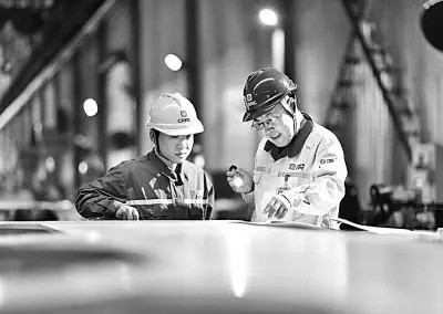 中国中车首席技能专家王海(右)查看出口平车的焊接质量。新华社发